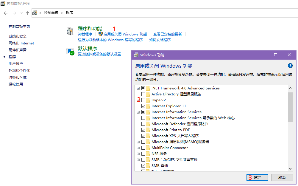 一个是 启用或关闭Windows功能,Win + R – 输入”control”,回车 – 程序